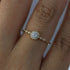 A brilliant round center stone glows within a halo of delicate stones, while two prong set side stones amplify its radiant fire. Set in warm gold, this stunning halo ring shines with elegant brilliance, adding luminous romance to every gesture and moment. Beautiful worn solo or stacked.