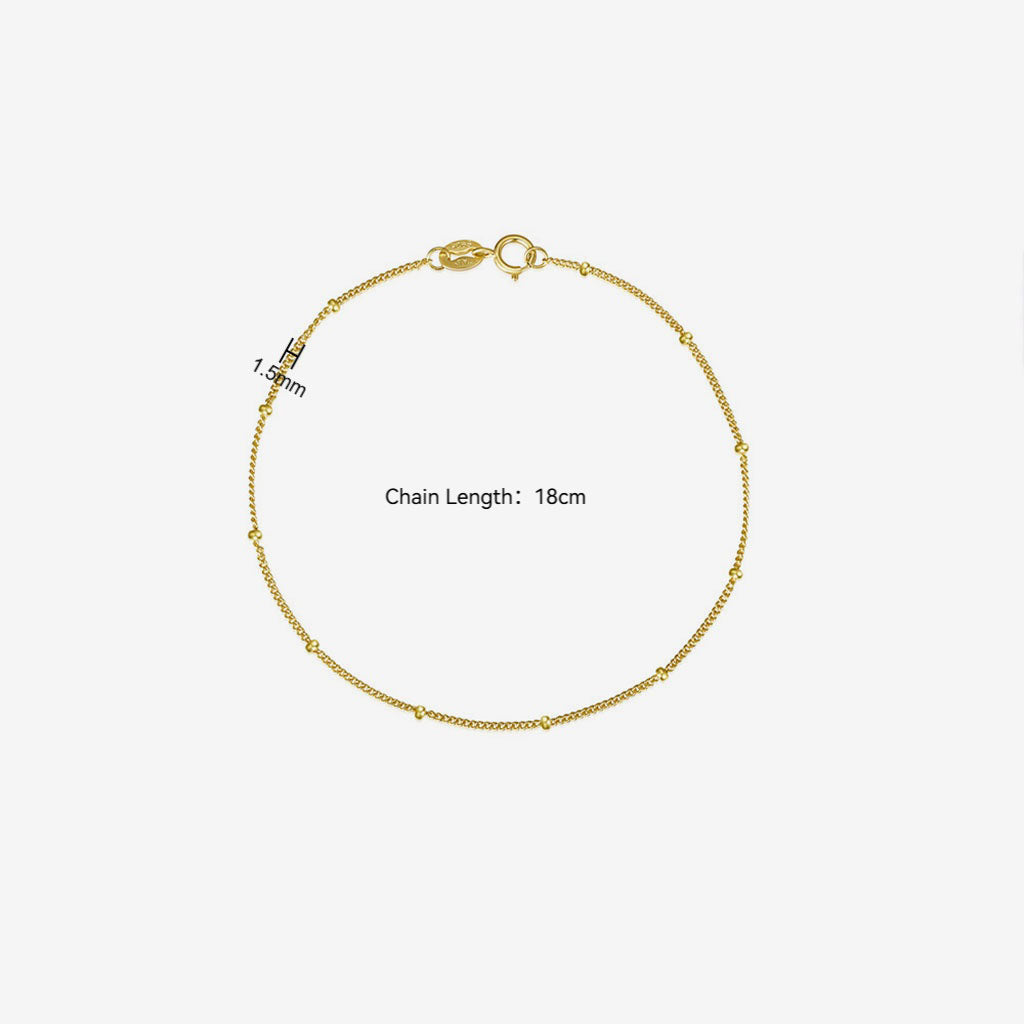 A warm glow glides along the wrist as the slender curb chain catches the light. Gently placed beads create a graceful station rhythm that adds texture and charm. Radiant and refined, this bracelet shines on its own and layers effortlessly for a golden everyday elegance.