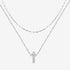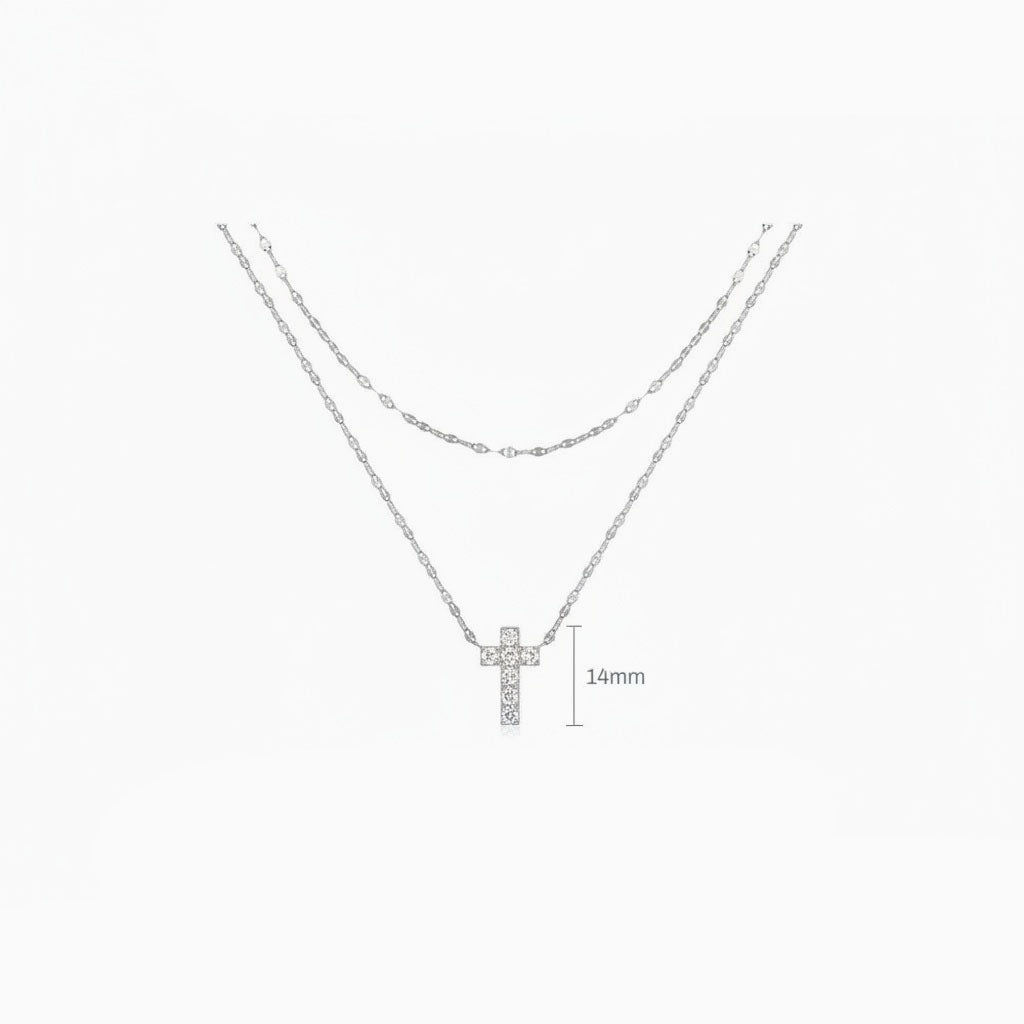 Two streams of cool light intertwined. This layered necklace combines a sleek lumachina chain with another anchored by a pavé cross that sparkles with serene brilliance. Refined, modern, and effortlessly graceful, it brings a luminous touch ideal for both everyday wear and layered styling.
