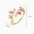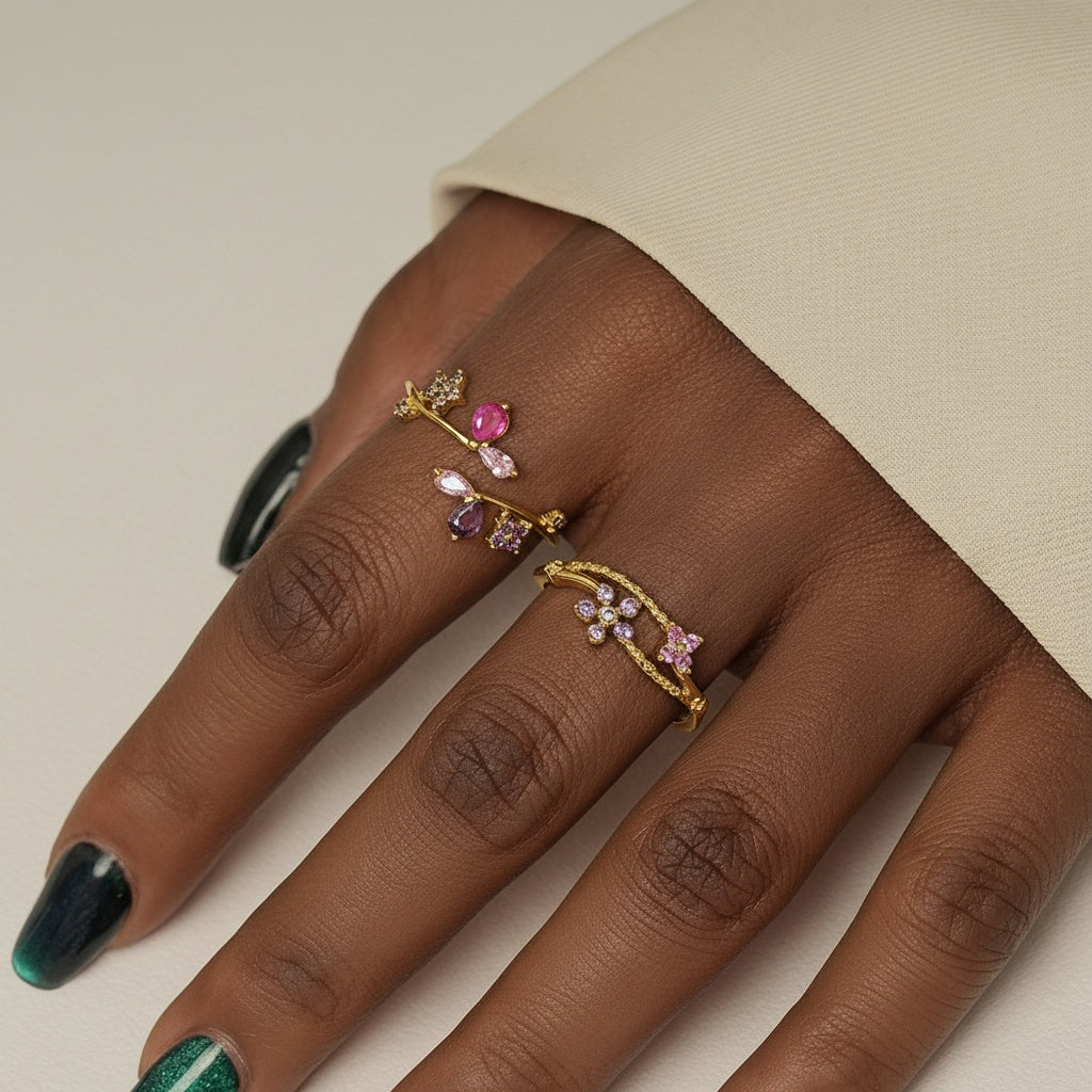 Blush pink meets soft violet in a gentle burst of color. Petal-cut stones bloom along a polished gold open band ring, blending marquise and round shapes into a fluid floral rhythm. Sculptural yet delicate, the design follows the finger like a gentle vine, letting your jewelry speak first.
