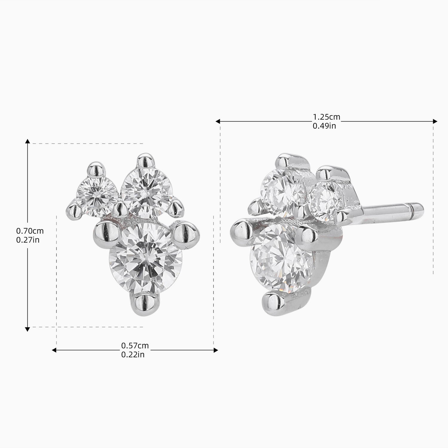 Three graduated gemstones form a luminous cluster in these stud earrings, crowned in mirror-polished silver. Rounded prongs read like molten droplets, cradling icy brilliance. The effortless chic silhouette refines the lobe with layered flashes. Minimal, architectural, quietly opulent.