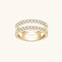 Radiant lines meet refined luxury. This gold double band ring features two parallel rows set with 2mm moissanites that catch the light with warm, vivid fire. The rich metal adds depth and glow, creating a bold yet elegant piece perfect for modern, luminous styling.