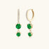 Rich in color and luxurious in feel. Front-set with sparkling white stones, these gold huggie hoops dangle two prong-set round emerald-colored stones, creating a sophisticated drop effect at your earlobes. They elevate your style and add vibrant elegance to every moment.