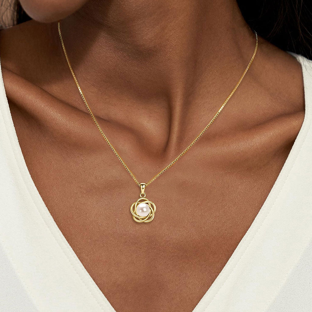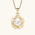 Sunlit bloom in every curve. Golden lines form a continuous, intricate petal design that cradles a radiant freshwater pearl at its center, like a flower’s heart, suspended on a sleek box chain. Let this exquisite jewel serve as a graceful reminder of your inner bloom, or a radiant gift to cherish.