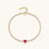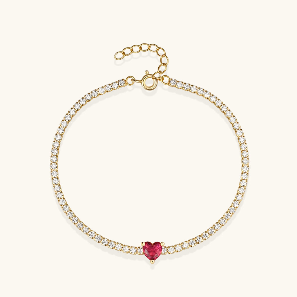 Red heart gleams. A vibrant heart gemstone crowns the center of a delicate gold tennis bracelet that layers effortlessly with other pieces. Perfect solo or stacked, it brings luminous sparkle and modern luxury for lovers of dainty gold bracelets, heart jewelry, and minimalist layering.