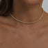 A cascade of golden starlight drapes around the neckline. This gold tennis chain necklace is fully iced out with sparkling stones in classic 4-prong settings that catch every glimmer of light. Timeless and luminous, it radiates bold glamour and refined elegance, perfect for layering or wearing alone as a statement piece.