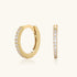 Quiet radiance. These shimmering gold huggie hoops trace a half-eternity of shimmering stones along a polished curve, reflecting light with subtle brilliance. Minimal, modern, and delicately playful, these pave earrings bring understated luxury to everyday moments or layered styling, a refined story of elegance in motion.