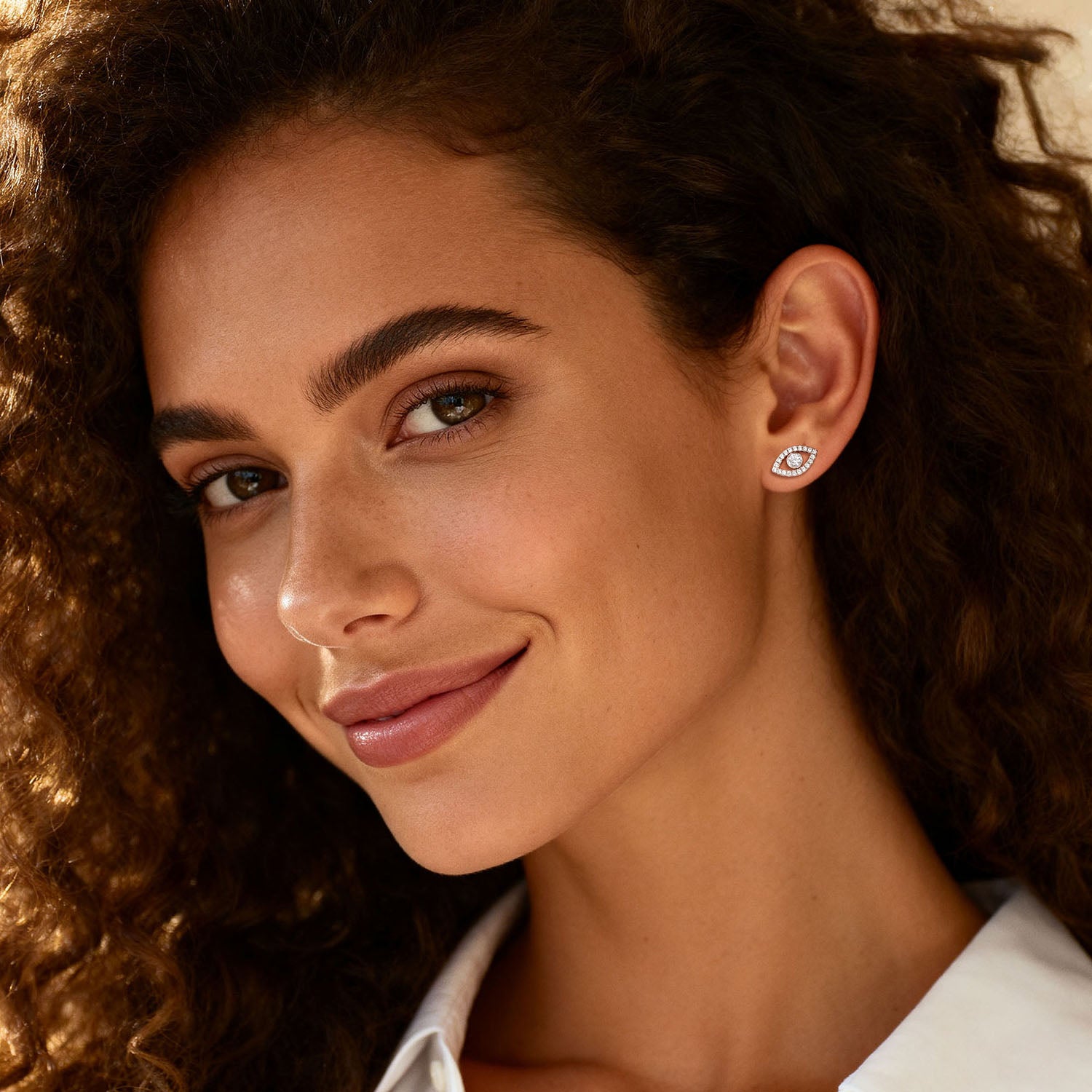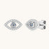 Protect your energy with a modern edge. These iced-out Evil Eye earrings feature a central Moissanite gemstone surrounded by a halo of smaller accent stones. Wear these jewel-like silver studs solo or layered and let them guard your vibe while catching every eye.