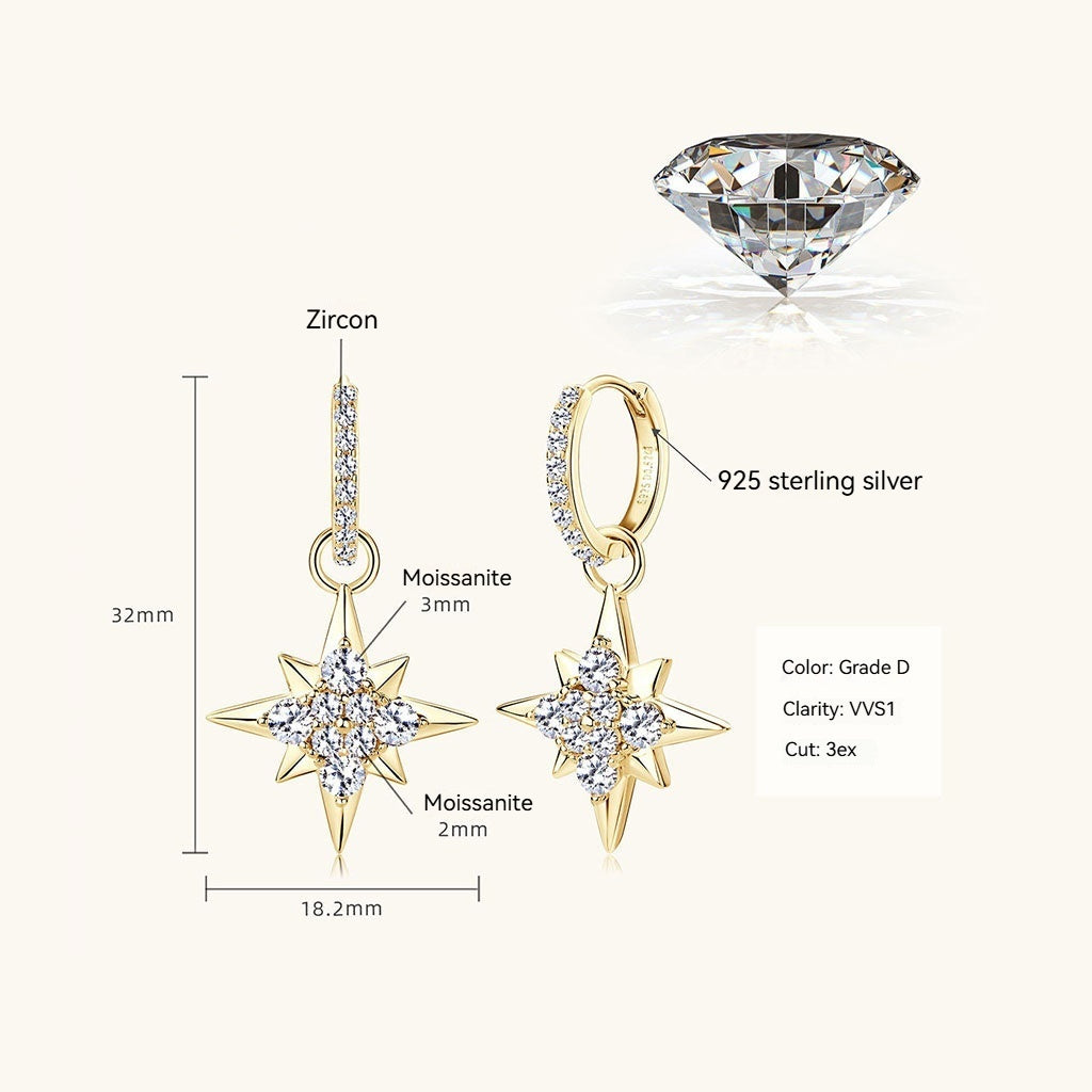 Embrace celestial luxury! These golden star moissanite earrings feature zircon-studded hoops that set off the north star-shaped moissanite cluster beautifully. Gold meets moissanite, adding magic and sophistication to daily or special occasion styles.