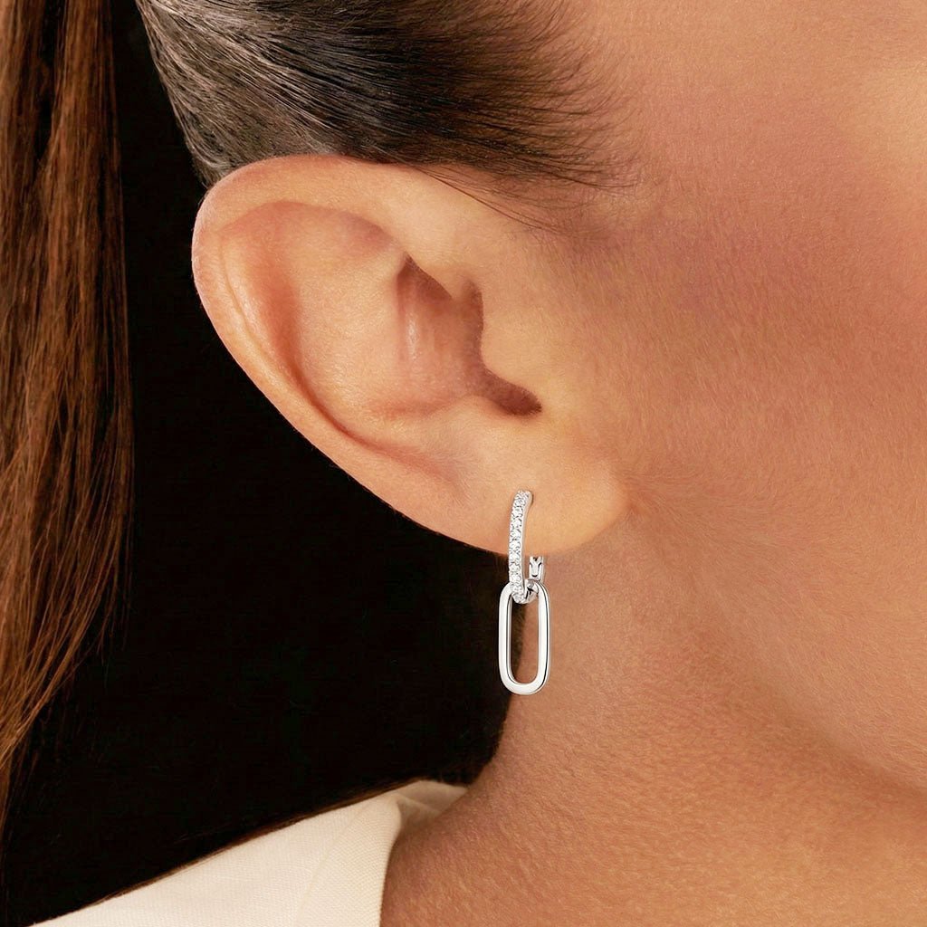 Dual delight. These functional silver double hoop earrings feature a front-set moissanite link with a removable polished paperclip drop. Wear the sparkling link alone for subtle elegance or combine both for a glamorous, statement-making look, perfect for everyday style or parties.