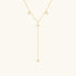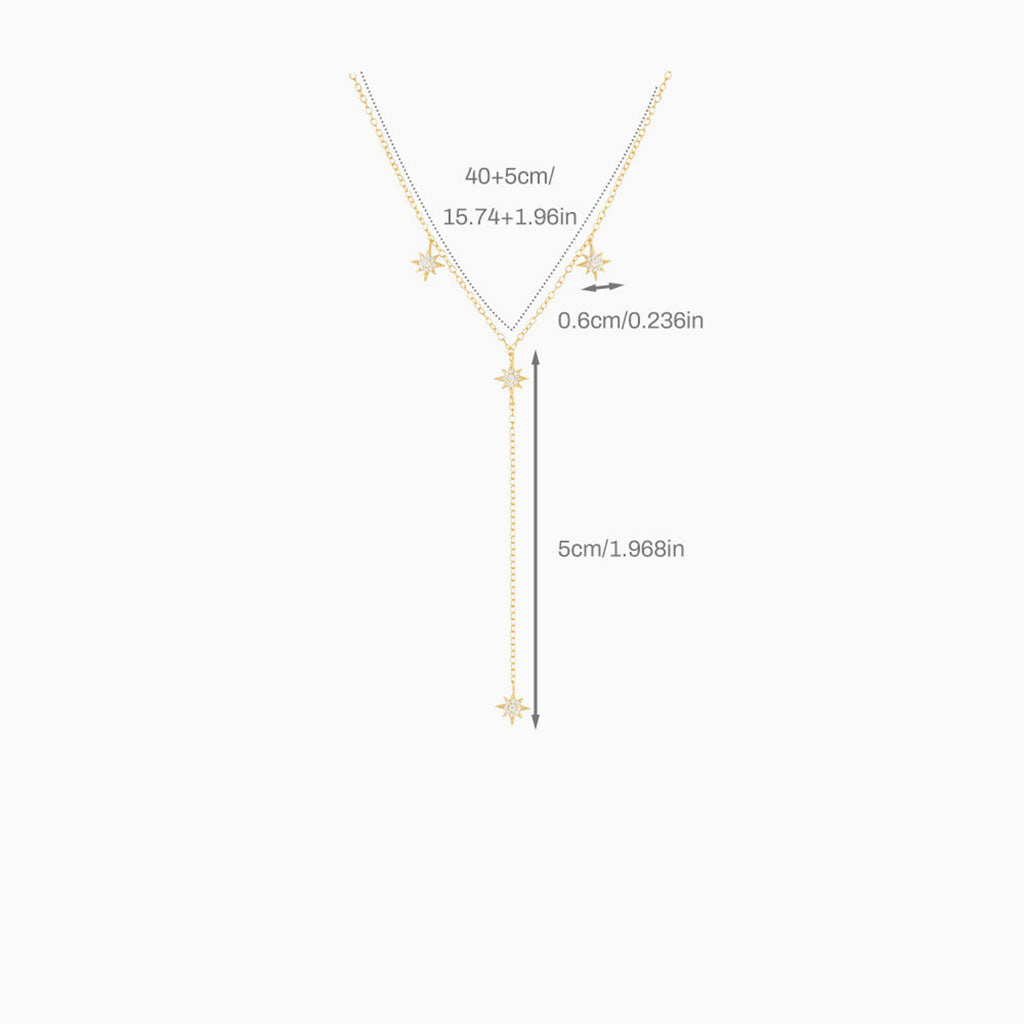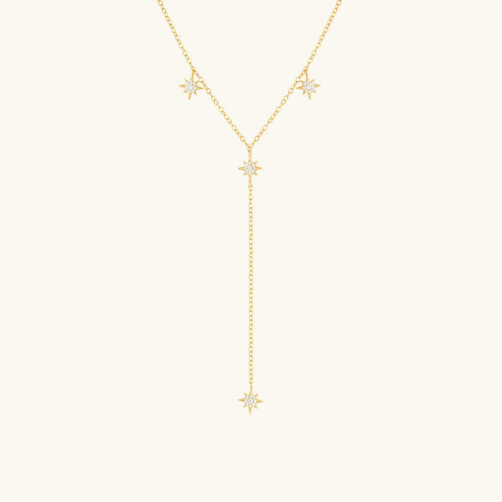 Golden starlit Y necklace. Four pavé north stars light up this slim Y-shaped design, with two gently dangling, one centered, and one shining at the drop’s end. Delicate and radiant, this gold necklace adds celestial elegance to your look and makes a heartfelt gift or personal treat.
