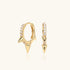 Edgy elegance. These gold huggie hoops feature a pavé of sparkling stones and three sculptural spikes, catching light with every movement. Minimal yet striking, these inverted spike earrings add a subtle playful edge to daily wear or layered styling, a quiet celebration of modern sophistication.