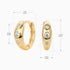 A golden burst of starlight. These dome huggie hoops are adorned with pavé gemstones at the front, sparkling with every turn. Smooth, sculptural, and luminous, these starburst earrings bring playful elegance and radiant shine—perfect for solo wear, stacking, or layering for personalized, celestial styling.