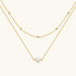A delicate dance of light and texture. This gold layered necklace pairs a shorter beaded station strand with a longer dainty glass pearl chain, creating a graceful rhythm that shimmers with every movement. Elegant and luminous, it adds refined charm perfect for layering or wearing alone.