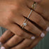 A shimmering 6mm gemstone takes center stage, flanked by three sparkling side stones on each side, capturing light from every angle. Set in warm gold, this halo ring exudes timeless elegance and refined brilliance, creating a luminous focal point for every gesture and moment.