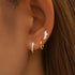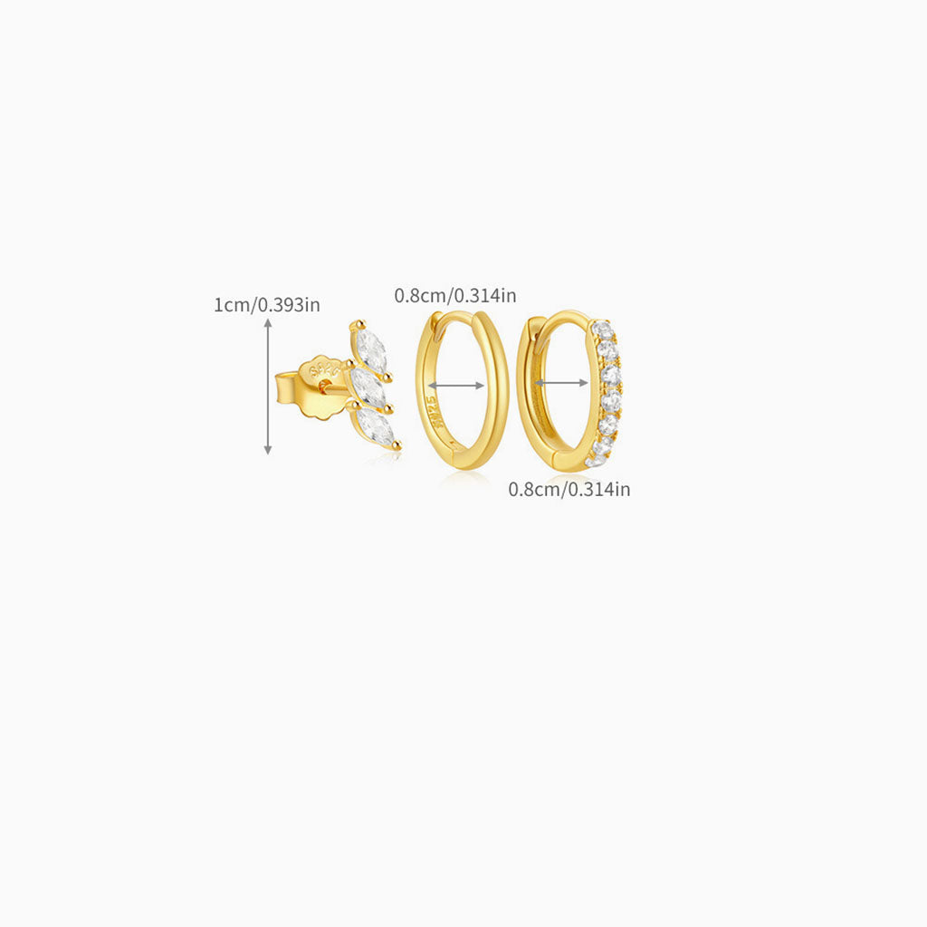 A golden trio of quiet brilliance. One delicate three-stone stud shimmers with subtle sparkle, a polished huggie hoop catches the light in fluid curves, and a half-eternity diamond hoop glows with refined elegance. Each piece in this gorgeous earring set shines individually while harmonizing in a serene, luminous glow.