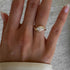 A luminous pear accent set sideways. A pear-shaped stone glimmers like a droplet of captured light, lying horizontally at the center as polished golden arcs sweep outward in an elegant embrace. The fluid curves frame its brilliance with graceful modern refinement, creating a radiant statement ring for every occasion.