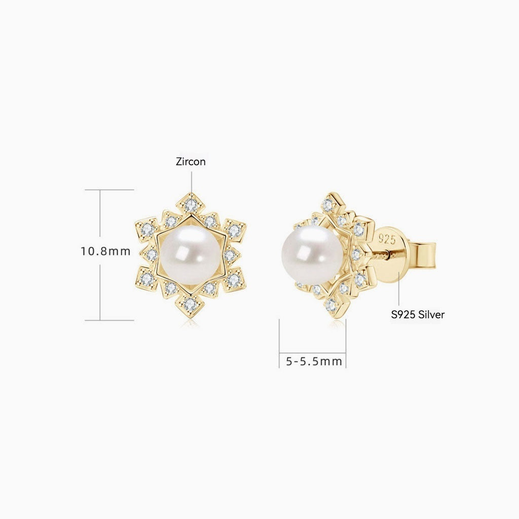 Snowflake Pearl Elegance. A lustrous cultured pearl rests at the center of a sparkling snowflake crafted from mini stones on polished silver. The stunning studs contrast with the crisp sparkle, adding instant luxe to your winter outfits and elevating your effortless chic.