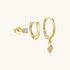 The more, the merrier! This triple earring set adds subtle shine to your rotation, featuring a solitaire stud, slim huggie hoop, and softly elongated drop. Set in warm gold with delicate stones, each piece is light and effortlessly wearable from morning to night.