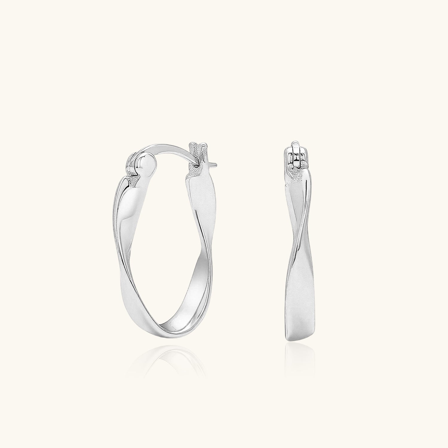 Sleek curves, quiet movement. These silver twisted hoops catch light along their polished, sculptural surface, creating a subtle shimmer with every turn. Minimal yet striking, these wavy oval hoops bring effortless elegance and modern refinement to everyday or layered styling.