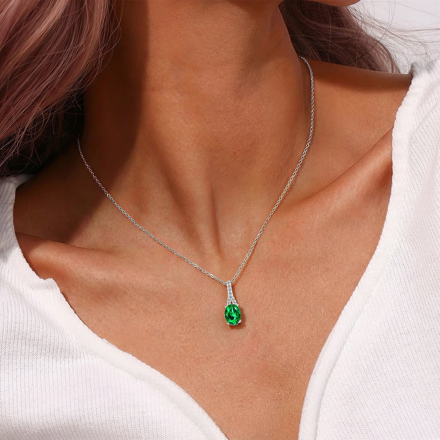 Radiant verdant tear. An oval emerald-colored stone cascades over tower-shaped mini stones, forming a luminous teardrop pendant in sleek silver. Representing clarity, growth, and heartfelt intentions, this pendant turns every moment into something extraordinary.